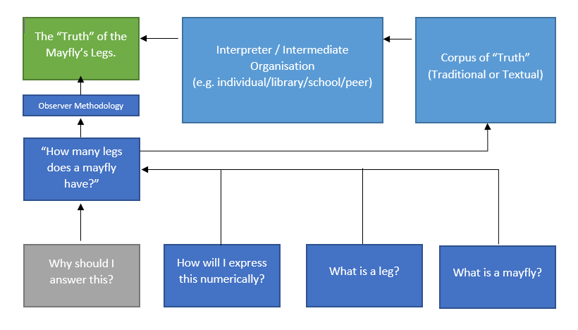 Below is a diagram showing two possible routes to the “truth” of the mayfly’s legs; firstly, Boyle’s preferred empirical approach (stating that rationally acceptable beliefs are only justifiable or knowable through experience), secondly, a traditional academic approach (where knowledge imparts from a culturally-derived source).